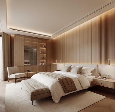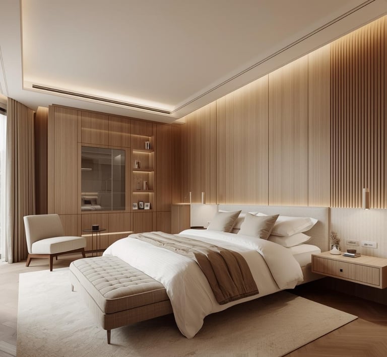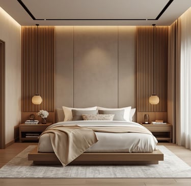 Serene bedroom interiors designed for rest and comfort. Soft textiles, natural materials, and muted color palettes define luxury minimal bedrooms with a peaceful, hotel-like aesthetic.