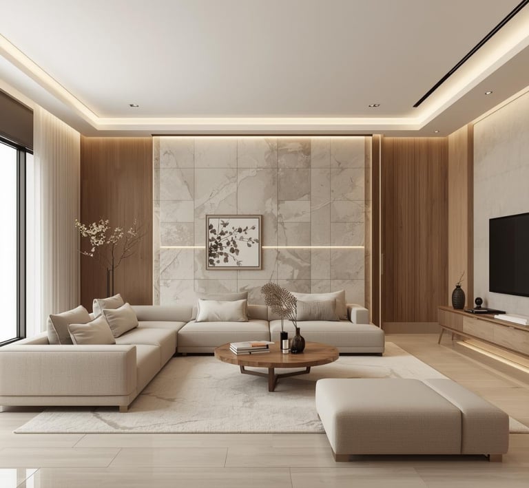 Calm, sophisticated living spaces with minimal furniture, layered textures, and warm neutral tones. Clean-lined sofas, statement materials, and natural light create an inviting modern luxury atmosphere.