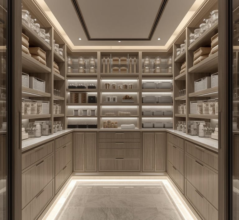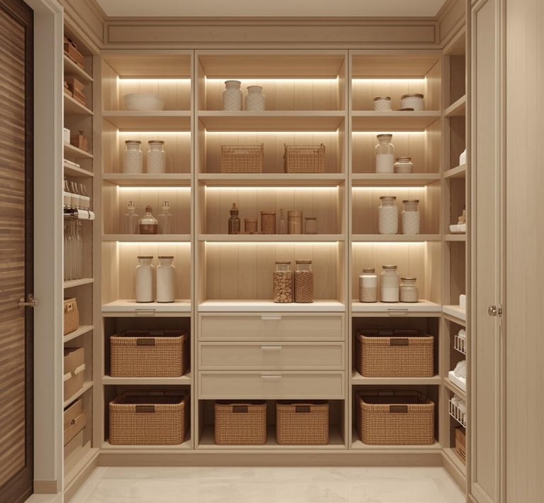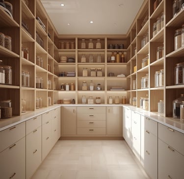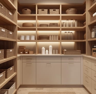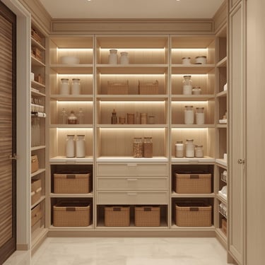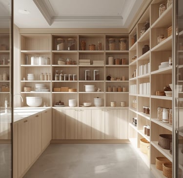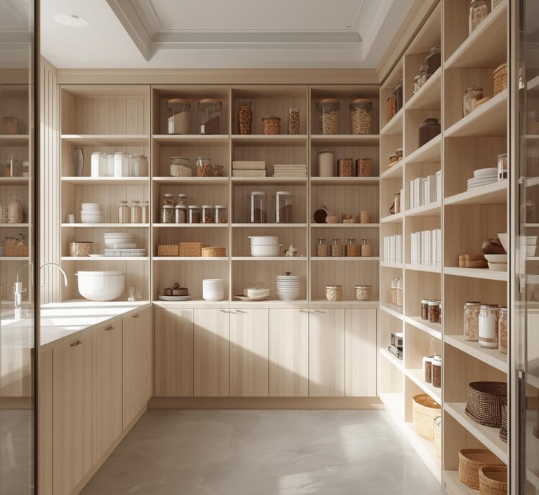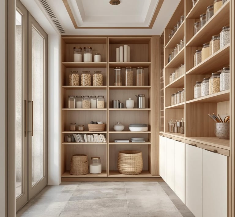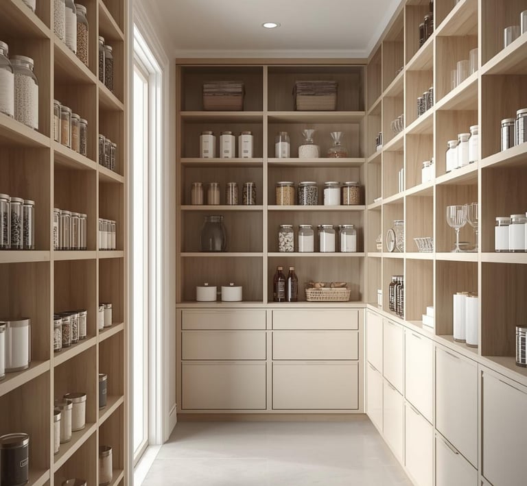 A clean, well-organized pantry designed with minimal shelving, labeled containers, and neutral storage solutions. Explore ideas for jars, baskets, organizers, and layout tips that create a functional and aesthetically pleasing space