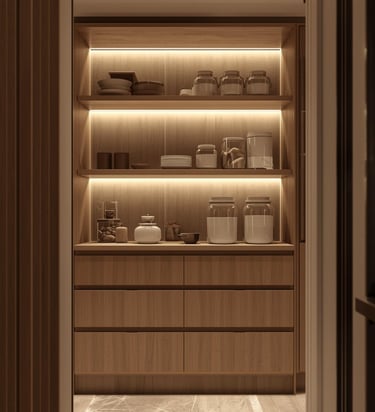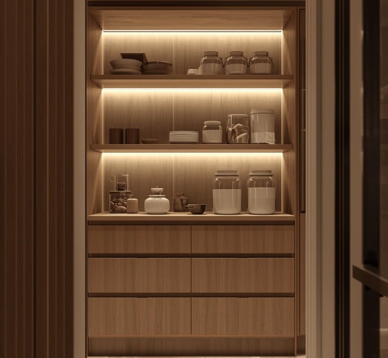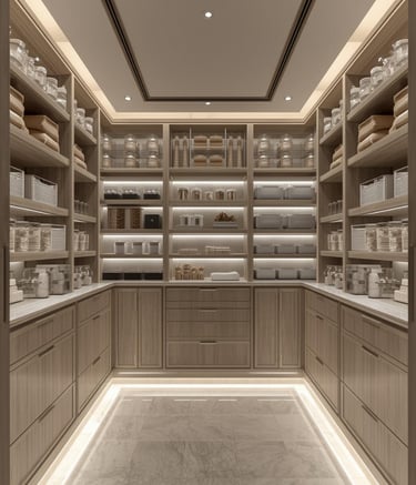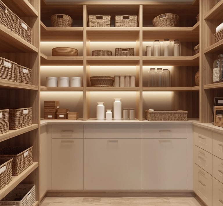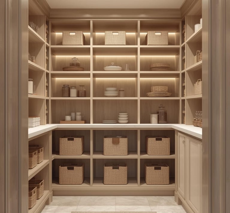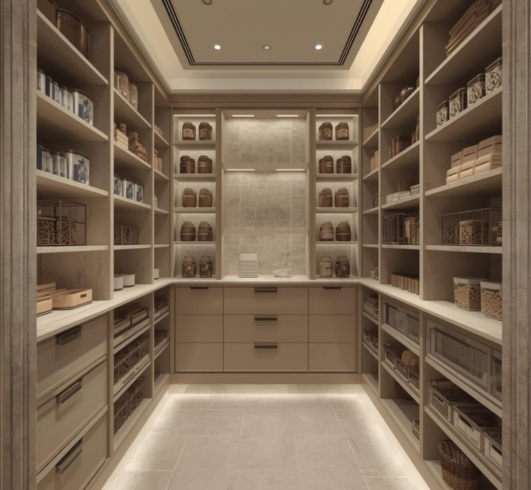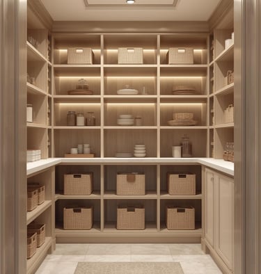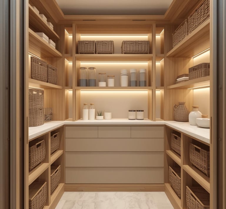 A clean, well-organized pantry designed with minimal shelving, labeled containers, and neutral storage solutions. Explore ideas for jars, baskets, organizers, and layout tips that create a functional and aesthetically pleasing space