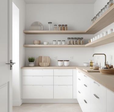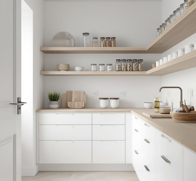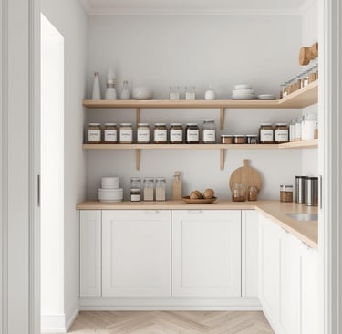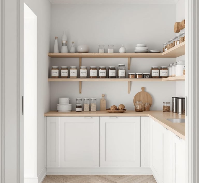 A Scandinavian pantry is designed for clarity and organization. Light wood shelving, clear glass jars, simple labels, and neutral tones create a clean and functional space. Minimal styling paired with practical storage solutions keeps the pantry both beautiful and easy to use.