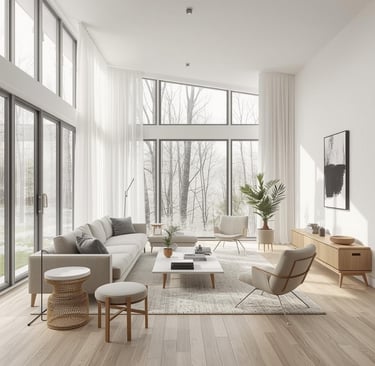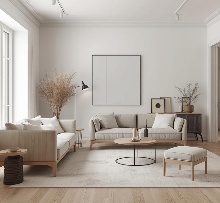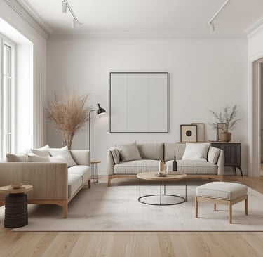 Scandinavian living rooms are bright, open, and welcoming. They feature simple sofas, light wood furniture, and layered neutral textiles such as wool rugs and linen cushions. Large windows, minimal wall décor, and airy layouts create a calm Nordic atmosphere that feels both modern and cozy.