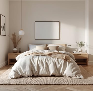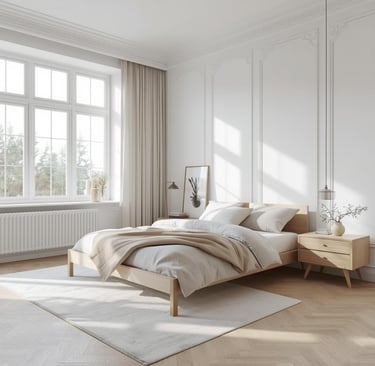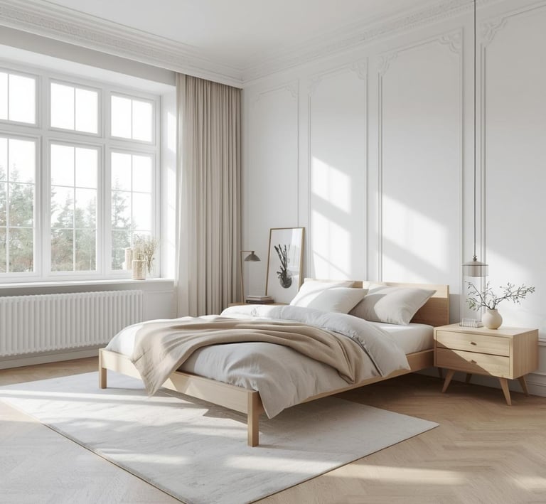Scandinavian bedrooms focus on rest and tranquility. Soft bedding in neutral tones, upholstered or wooden beds, minimal nightstands, and subtle textures help create a serene sleeping environment. Natural light, gentle lighting, and uncluttered styling promote a sense of calm and balance.