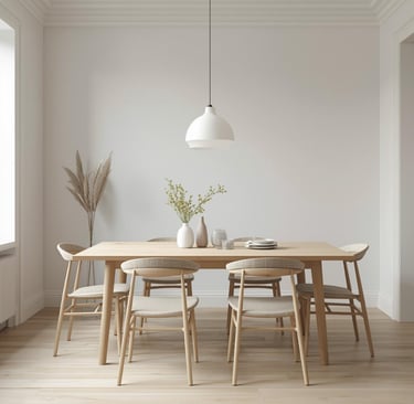 Scandinavian dining spaces are clean, functional, and inviting. Light wood dining tables, simple chairs, neutral color palettes, and minimal table décor create a timeless setting. The focus is on practicality, comfort, and natural materials that make everyday dining feel warm and effortless.